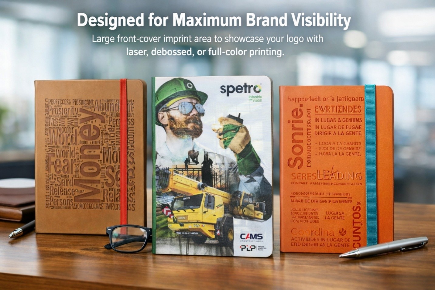 Ideas developed at its full capacity, with our; 100% Laser Print, 90% Debossed and 80% Screen front cover Imprint area