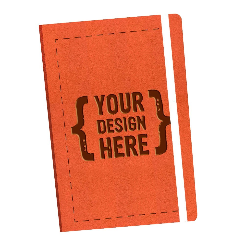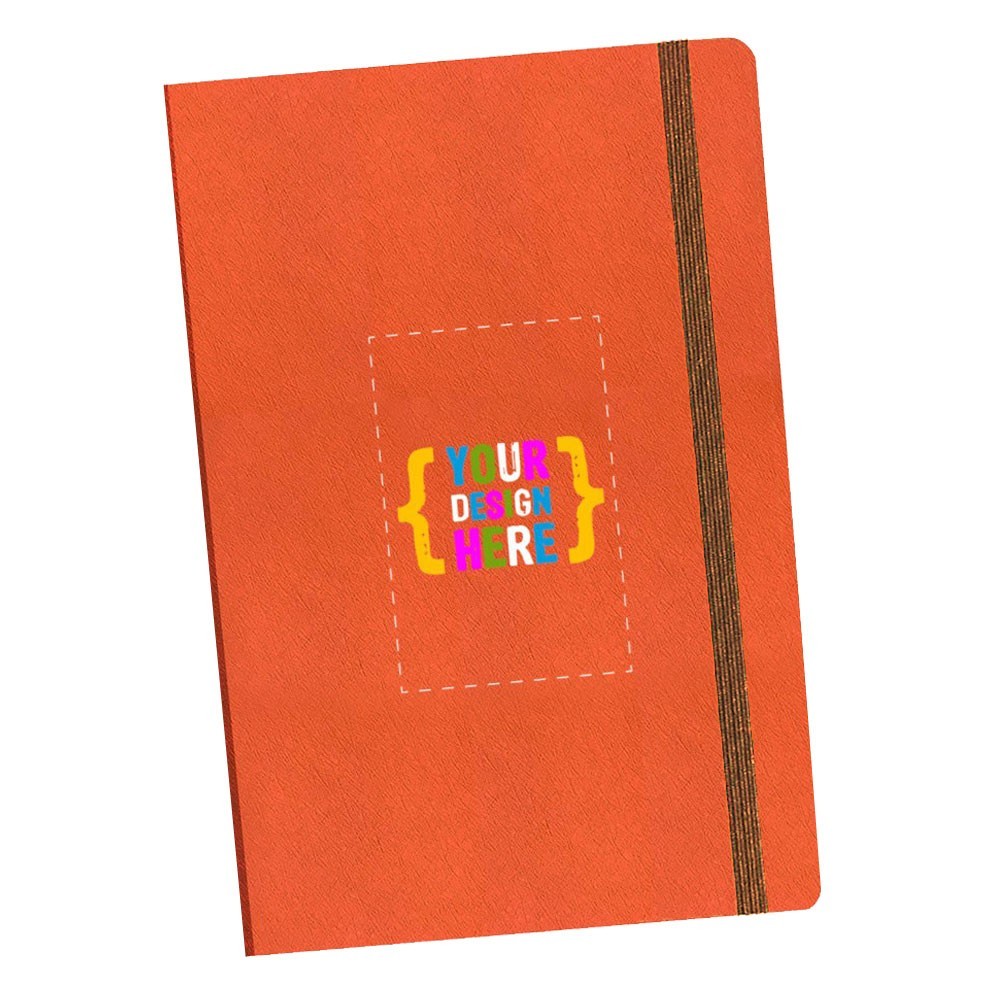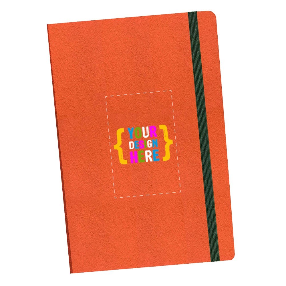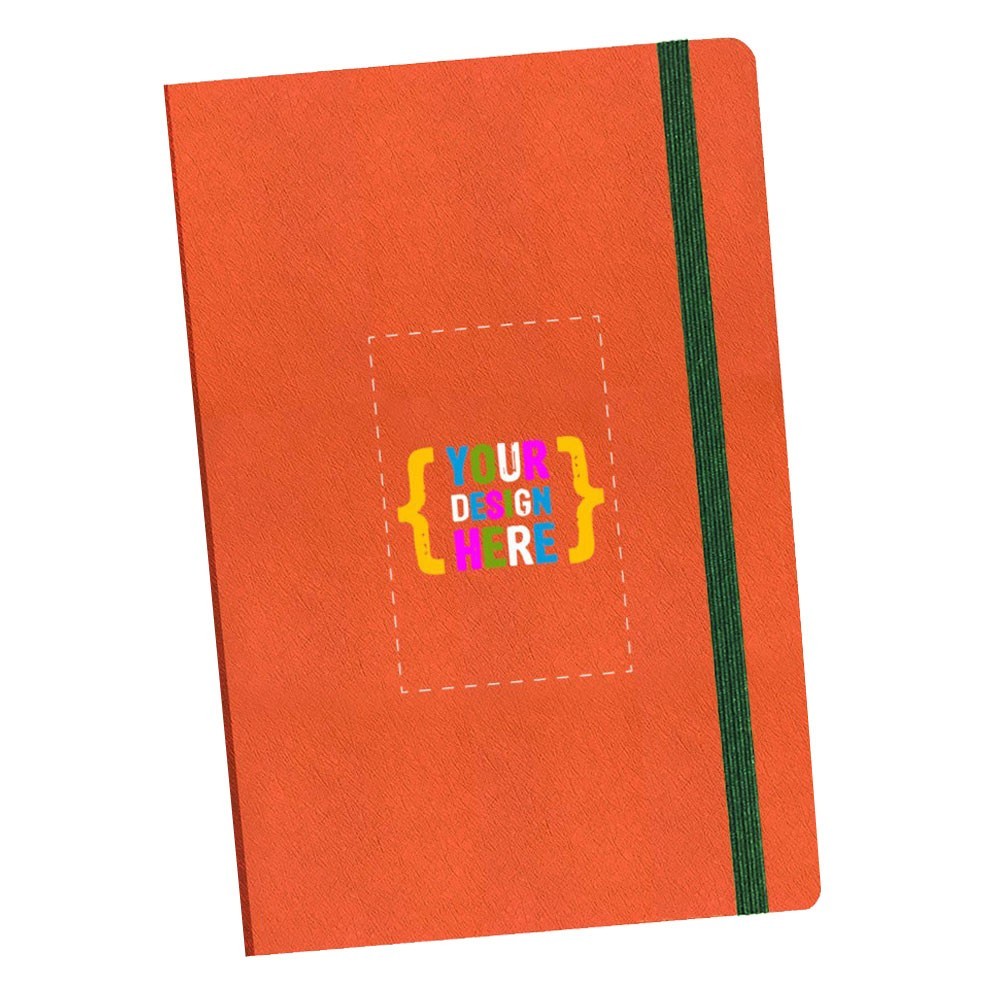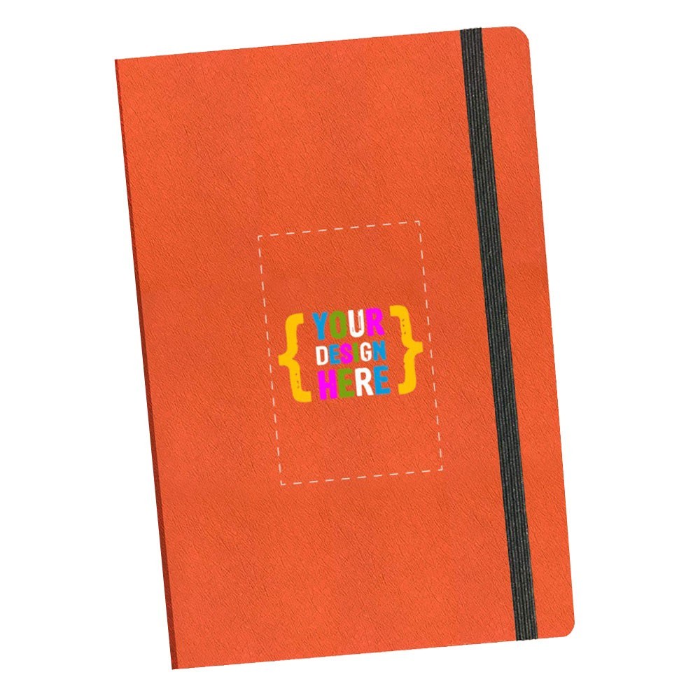 Siempre en stock, este diario de 5.5" x 8.5", viene con cuero vegano de calidad, selección de banda elástica, combinado con línea o interior en blanco. Área de impresión: Portada completa.