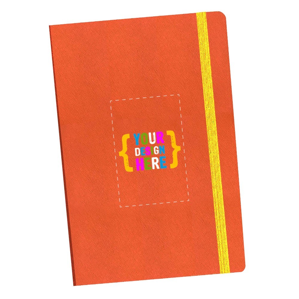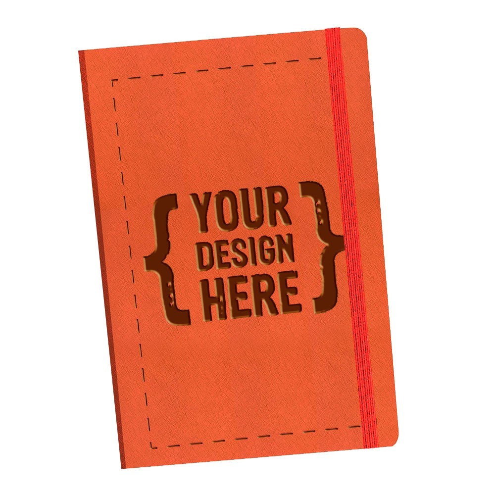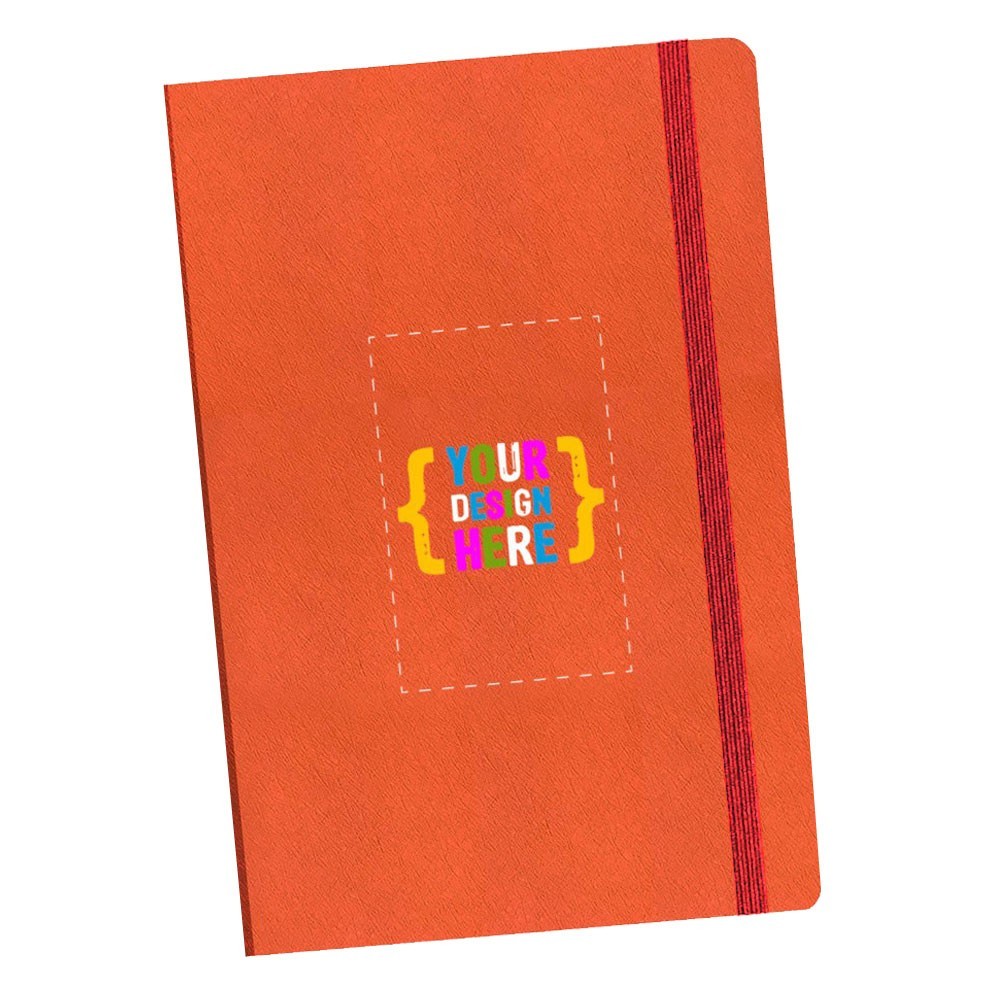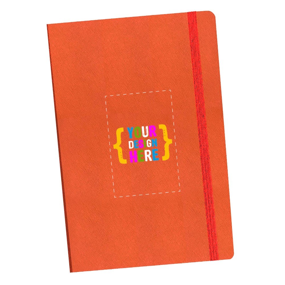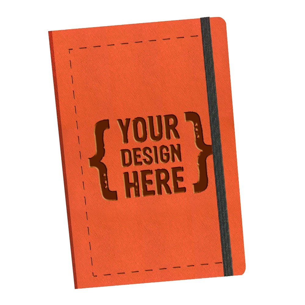 Siempre en stock, este diario de 5.5" x 8.5", viene con cuero vegano de calidad, selección de banda elástica, combinado con línea o interior en blanco. Área de impresión: Portada completa.